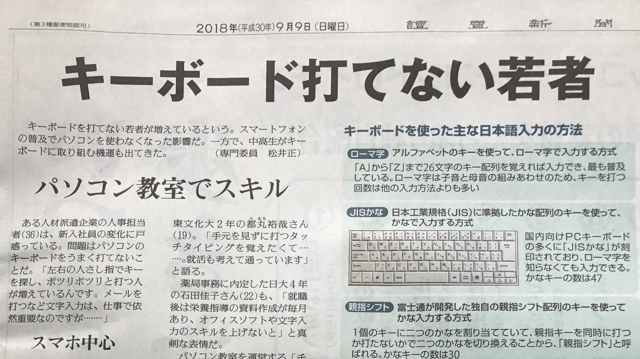 読売新聞 編集委員室 On Twitter スマホの普及でキーボードを打てない若者が増えています ある大学講師は毎年 1年生にパソコンで1200字 を打つ課題を出しますが 1分間に100字打てる人は1割程度 1200字を打ち終える時間は年々伸びているとか 一方 中学や高校で