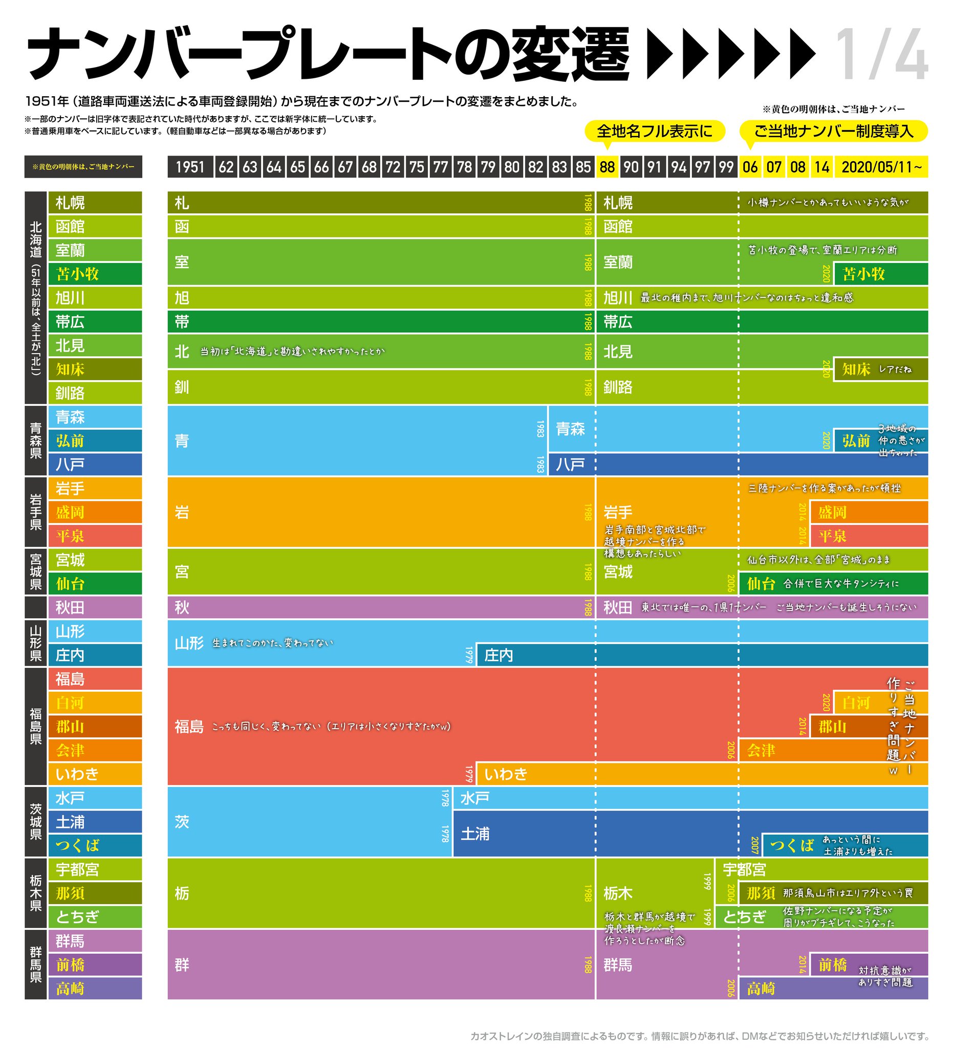 日本における ナンバープレートの地名 はどのように変化したのか 70年の歴史を図式化 えのげ