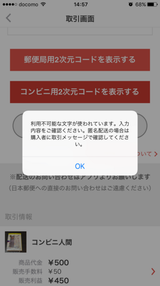 メルカリ ゆうゆうメルカリ便の2次元コード表示で 利用不可能な文字が使われています エラーが出る問題発生中